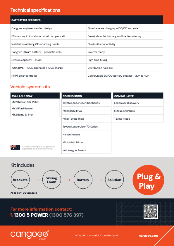 A design for quick installation with all the components included in a straightforward vehicle-specific kit has been created by the Australian engineering team at Cangoee. Utilising OE mounting points and factory grade looms to enable simultaneous charging through DCDC and solar.